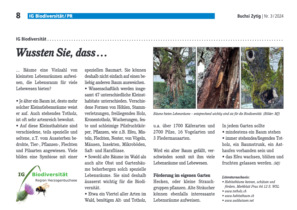 In der Forstwirtschaft werden die Biotopbäume schon seit längerer Zeit geschützt, weil man ihre Wichtigkeit für den Erhalt der Biodiversität erkannt hat. (WaG Art. 20 Abs. 4; BAFU 2021 Waldpolitik: Ziele und Massnahmen 2021-2024; WSL Merkblatt für die Praxis 64). Für das Biodiversitätskonzept wurden ökologisch wertvolle Biotopbäume mittels Feldbegehung erfasst. Dabei wurden auch sogenannte Vernetzungsbäume aufgenommen. Das sind meist einzelne, hohe Bäume, die den Siedlungsraum an sich und mit dem Wald vernetzen. Sie sind somit besonders wichtig für den Insekten-, Vogel- und Fledermausschutz. Viele der aufgenommenen Biotopbäume stehen in alten Hochstammobstgärten. Diese sollten möglichst erhalten bleiben. Ebenso weisen ortsbildprägende Bäume meist Baummikrohabitate auf, weil diese Bäume alt und gross sind. Diese Bäume sind geschützt (BauR Art. 21).